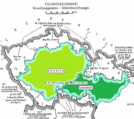 Unter Bruch des Münchener Abkommens von 1938 wurde die damalige Tschechoslowakei ohne die bereits annektierten Gebiete des Sudetenlandes und der Slowakei, die als Erste Slowakische Republik ausgegliedert wurde, 1939 formal in das Reichsprotektorat Böhmen und Mähren umgewandelt. De facto war das Gebiet eher eine autonome Provinz des Deutschen Reiches.